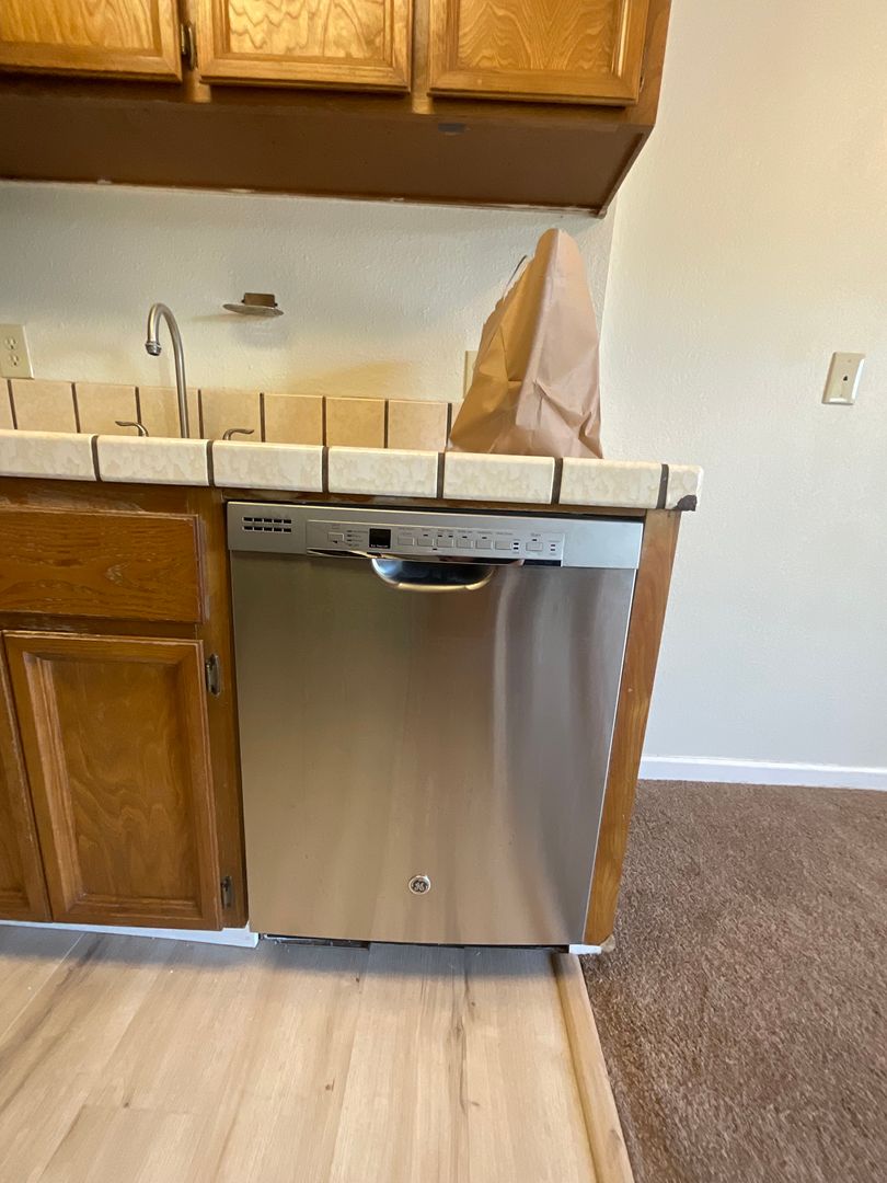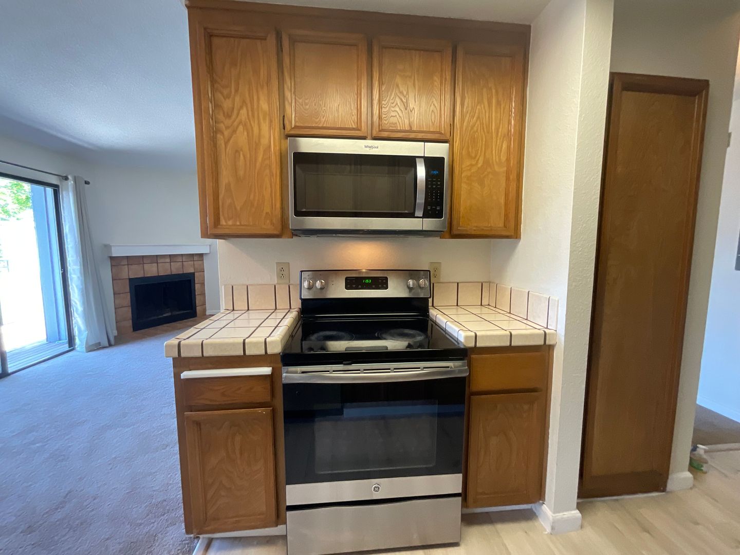 ***Updated kitchen with custom cabinets, tile countertops, and stainless steel appliances