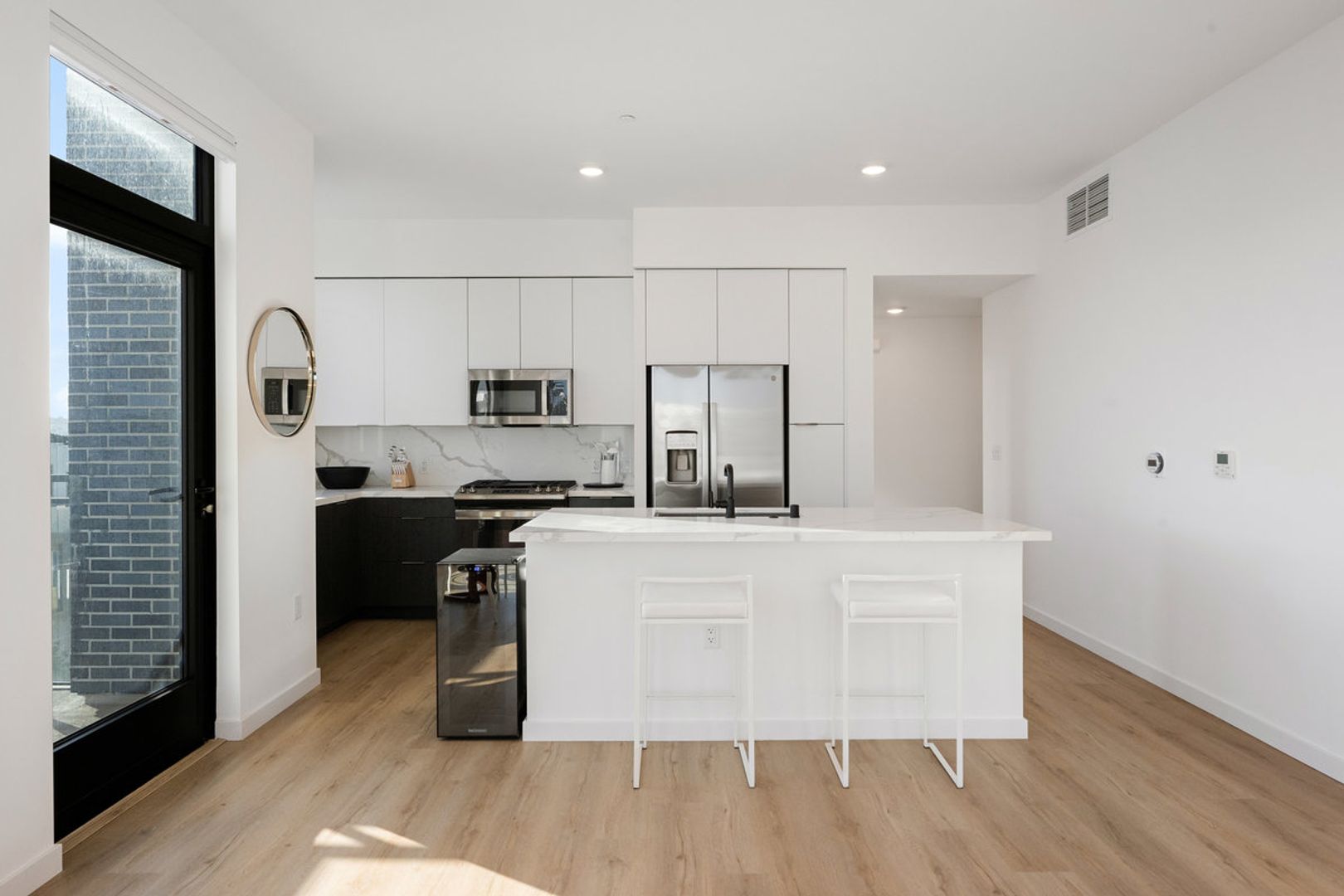 The open-concept living, dining, and kitchen areas are ideal for entertaining and everyday living. The chef’s kitchen features GE stainless steel appliances, Silestone quartz countertops, a Bianca Calcutta backsplash, and a large center island that makes a stunning focal point. Step onto your private balcony to enjoy your morning coffee or unwind at sunset with breathtaking views of the Bay and greenway..