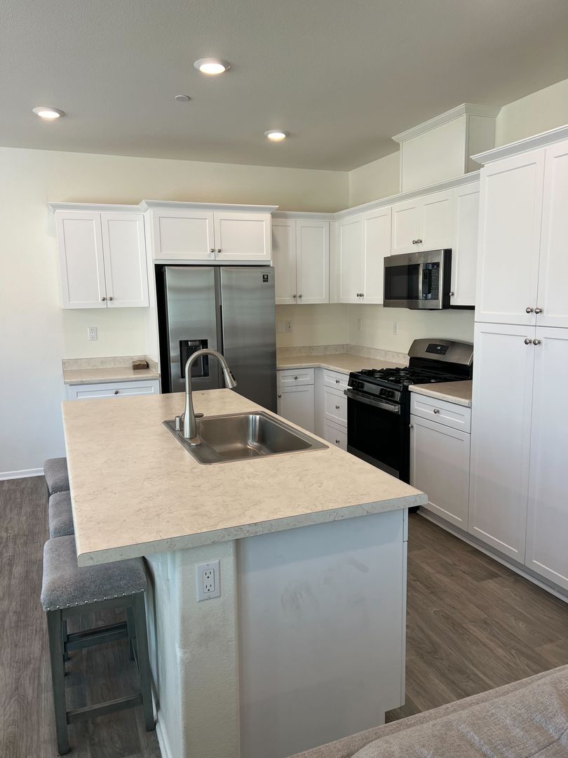 ***Modern kitchen with stainless steel appliances, ample cabinet space, and a center island